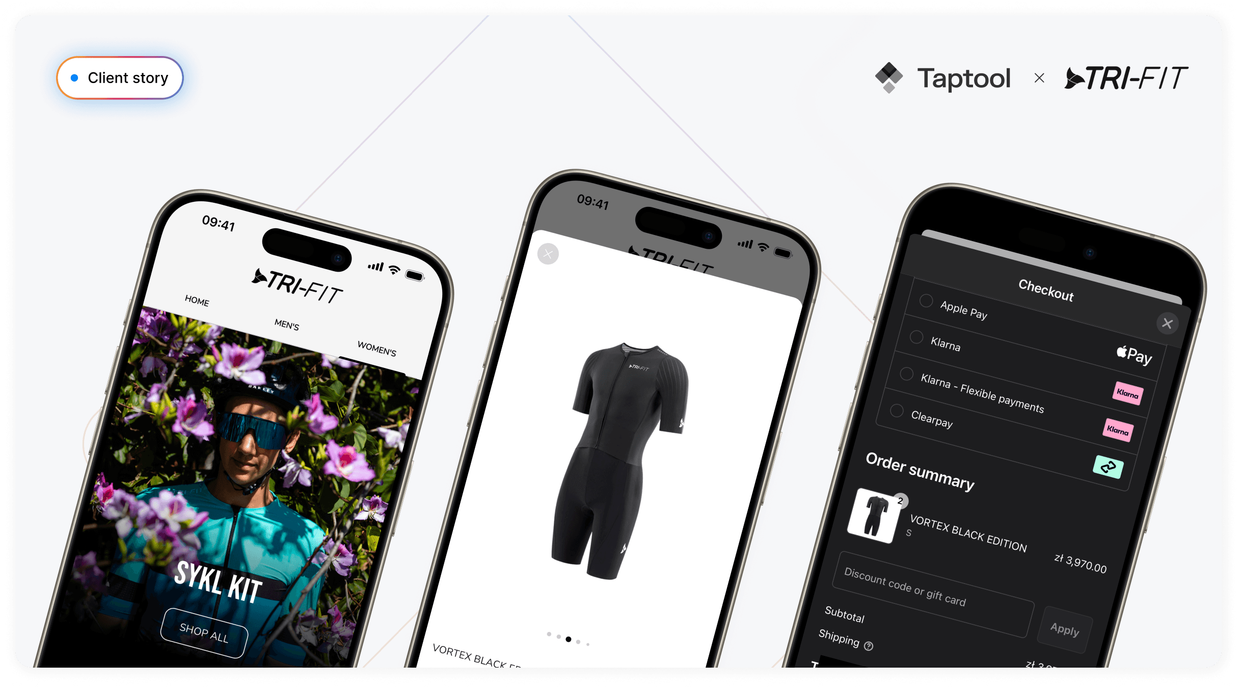 Today, the TRI-FIT app runs on Taptool end-to-end. Catalog, collections, search, product pages with rich media and sizing. Cart and native checkout (Shop Pay / Apple Pay / Google Pay). Accounts, saved items, and push notifications.